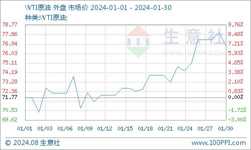原油市场,红海危机进一步升级,国际原油价格维持震荡上行,截止1月29日美国WTI原油期货主力合约结算价报76.78美元/桶,布伦特原油期货主力合约结算价报81.83美元/桶。另外,欧佩克+实行新的减产配额并且自愿减产,且沙特等宣布将严格执行,甚至将会延期到第二季度,给予油价进一步支撑。因此,2月原油价格有望维持震荡偏强运行。