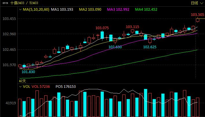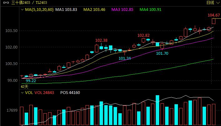 1月30日,国债期货全线收涨。30年期国债期货主力合约涨0.8%,盘中升至104.67,续创历史新高;10年期国债期货主力合约涨0.25%,盘中升至103.505,续创历史新高;5年期国债期货主力合约涨0.17%;2年期国债期货主力合约涨0.08%。