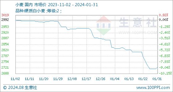 1月31日,生意社小麦基准价为2716.00元/吨,与本月初(2880.00元/吨)相比,下降了-5.69%。