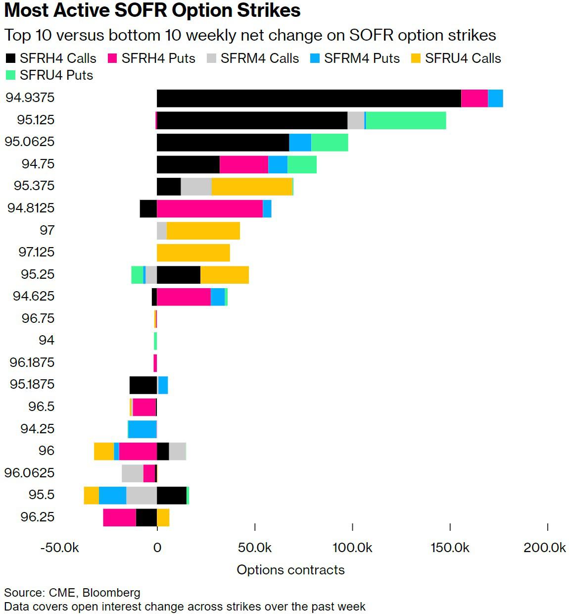 过去一周的期权活动见证了SOFR3月24日94.9375看涨期权的风险激增,该看涨期权领涨了本周的未平仓合约涨幅。