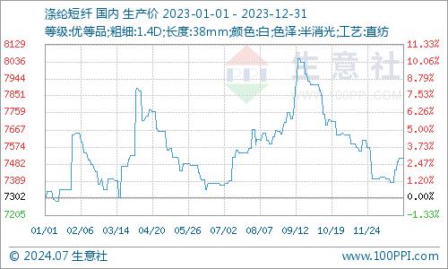产能上来看,2023年涤纶短纤产能过剩程度加剧,2023年新增产能46.5万吨,总产能1003万吨,其中有效产能达943万吨,常停产能达60万吨。新增产能释放的压力,供大于求的格局之下,2023年国内涤纶短纤价格整体呈现“三跌三涨”震荡走势,截止12月31日江浙主流工厂1.4D*38mm均价在7512元/吨,较年初上涨2.88%。