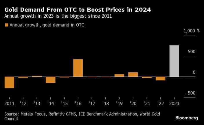 世界黄金协会的数据显示,去年场外交易市场的需求年增长率达到753%,是至少自2011年以来的最高水平。Cavatoni称,预计投资者今年将继续加速积累黄金,这在很大程度上是受美联储预期转向宽松政策的推动。