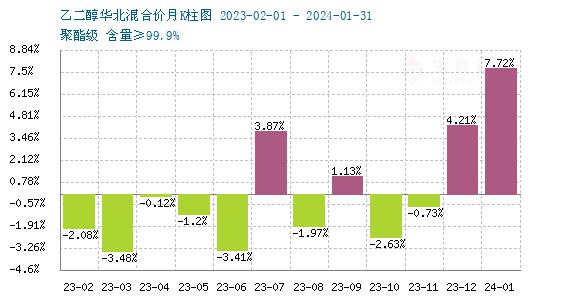 1月乙二醇价格上行。据生意社数据显示,截止1月31日,国内油制乙二醇均价为4640元/吨,较月初上涨7.72%。各地区价格如下: