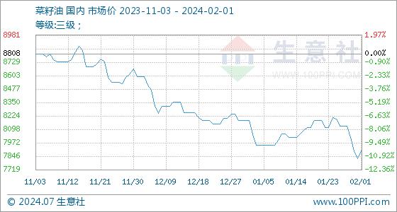 2月1日生意社菜籽油基准价为7825.00元/吨