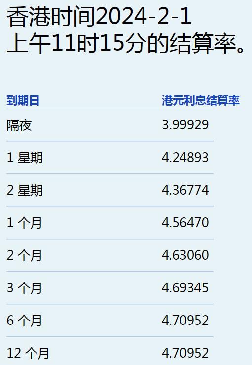 2月1日,港元拆息普遍下跌,其中,隔夜息由昨日的5.12536%高位急跌112基点,至3.99929%,创近一周新低。与楼按相关的一个月拆息连跌两天,为1月26日以来最低。一周拆息微降至4.24893%。反映资金成本的三个月拆息跌至4.69345%,与同期美元LIBOR息差维持约87基点。六个月期及一年期齐报4.70952%。