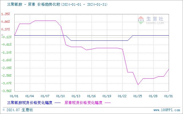 从需求端来看:农业需求减弱,工业需求一般,尿素出口暂无利好。农业零星补肥。复合肥厂开工率一般,对尿素采购积极性正常。板材、三聚氰胺企业开工一般,刚需采购为主。1月份三聚氰胺价格低位盘整,价格为7475元/吨。从供应方面来看:检修企业开始复产,尿素日产在16万吨左右,供应一般。