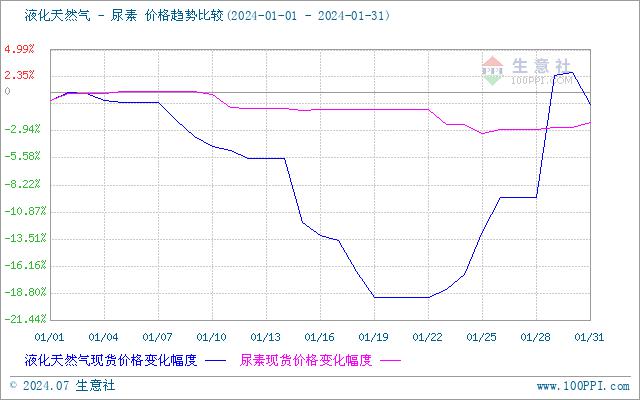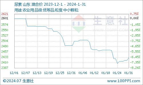 据生意社商品分析系统:1月份山东尿素主流市场价格震荡下跌:尿素价格由月初的2485元/吨下跌至月末的2431.67元/吨,跌幅2.15%,月末价格同比下跌12.69%。