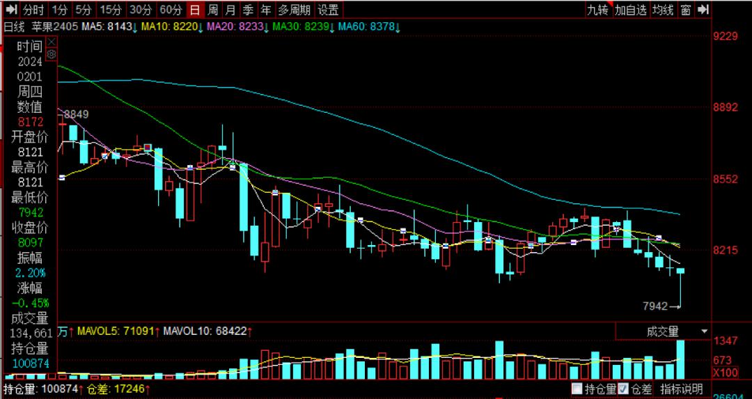 自上周四以来,苹果期货主力2405合约持续下跌,周四探底回升,盘中最低价为7942元/吨。截至收盘,主力合约报收于8097元/吨,跌幅0.45%。