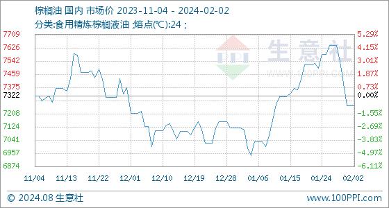 2月2日,生意社棕榈油基准价为7258.00元/吨,与本月初持平。