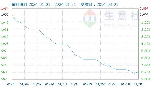 据生意社商品行情分析系统显示:1月,利空打压,饲料原料行情全面下跌,饲料指数跌跌不休,整体振荡下跌超8%。1月31日饲料原料为963点,较昨日上升了2点,较周期内最高点1357点(2022-11-10)下降了29.03%,较2016年04月10日最低点747点上涨了28.92%。(注:周期指2014-03-01至今)