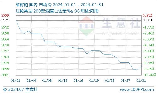 据生意社价格监测,2024年01月饲料原料价格涨跌榜中上涨的商品共0种,下跌的商品共5种,涨跌为0的商品共0种。下跌的主要商品有:豆粕(-13.58%)、DDGS(-10.81%)、菜籽粕(-8.75%)。