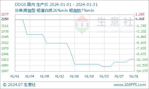 DDGS:1月,国产DDGS持续下跌,临近月底迎来小幅反弹,整体下跌超10%。终端饲料需求转淡,玉米行情走弱,替代品豆粕行情下滑,多重利空因素打压,国产DDGS行情纷纷下行,行情走跌。酒精厂挺价信心不足,行情持续弱势为主。截止1月25日,市场均价跌至1875元/吨,下跌12%。月底,备货行情拉动,国产DDGS库存趋紧,行情小幅反弹,上涨0.92%。