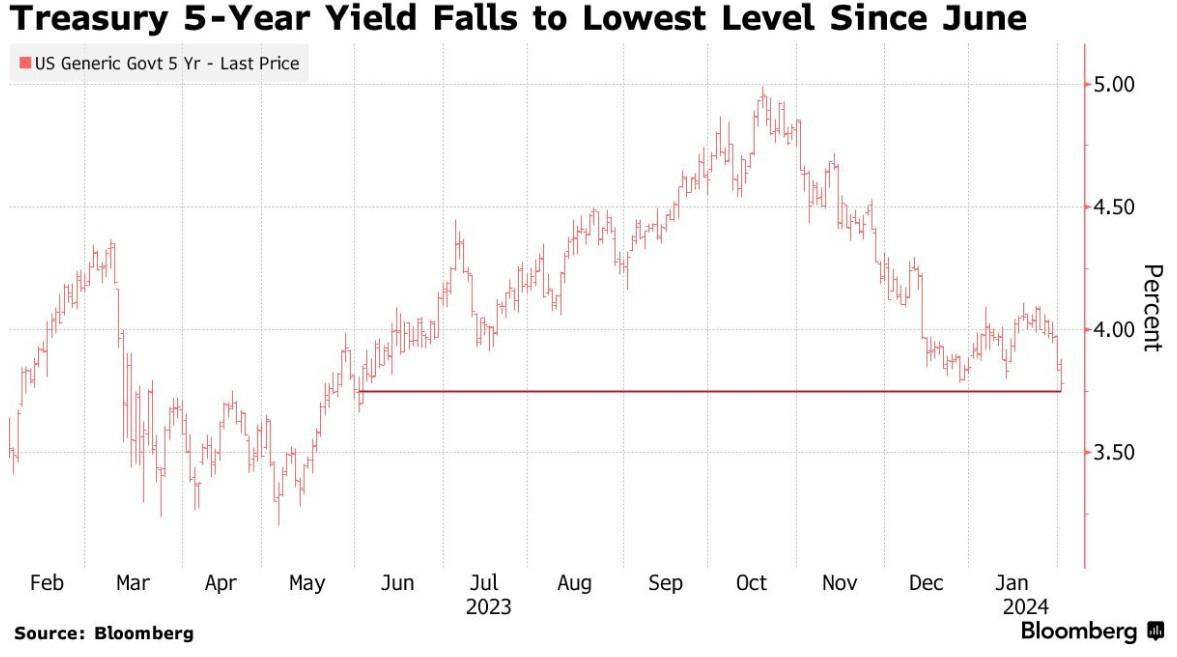 美国五年期国债收益率下跌9个基点,至3.75%,为去年6月以来的最低水平。与此同时,交易员预计美联储今年的降息幅度会更大。掉期合约显示,3月开始的可能性略有增加,此前一天,美联储主席鲍威尔表示,这种可能性不大,令这一押注受挫。