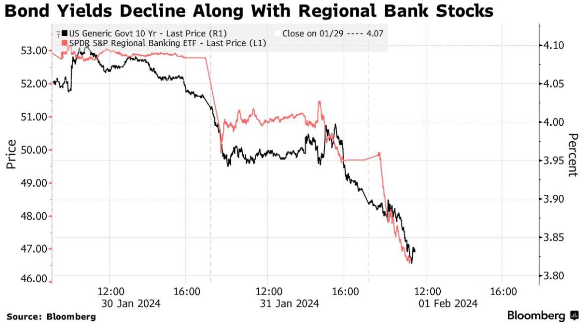 银行股延续了周三引发的跌势。周三,纽约一家小型银行出人意料地公布了亏损,并削减了股息——预计美国商业地产损失将进一步加剧。对投资者来说,这让人想起去年3月美国地区银行股的暴跌,那次暴跌也推动了对美国国债的避险需求。