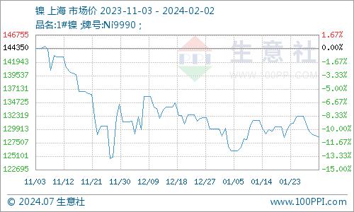 据生意社镍价格监测,本周镍价小幅下跌。截止2月2日,现货镍报价128516.67元/吨,较周初下跌1.76%,同比下跌43.88%。