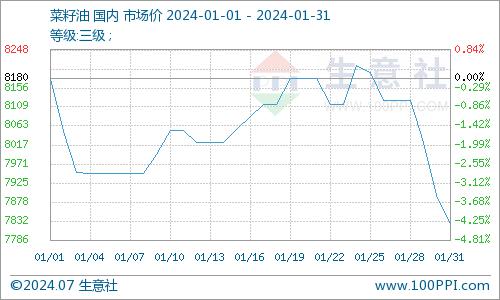 1月菜油行情整体下跌4.34%。1月菜油行情,先震荡上涨,月末下滑明显。受节日消费提振,上半月菜油消费量增加,库存呈下滑态势,利好菜油行情。月末,利空来袭,主要受南美大豆丰产预期维持,南美大豆开始进入收割期,供应压力增加,利空油脂行情走弱。前期进口菜籽和进口菜油数量大增,供应充足背景下,加之节前备货基本结束,需求端支撑有限,预计节前震荡调整运行为主。