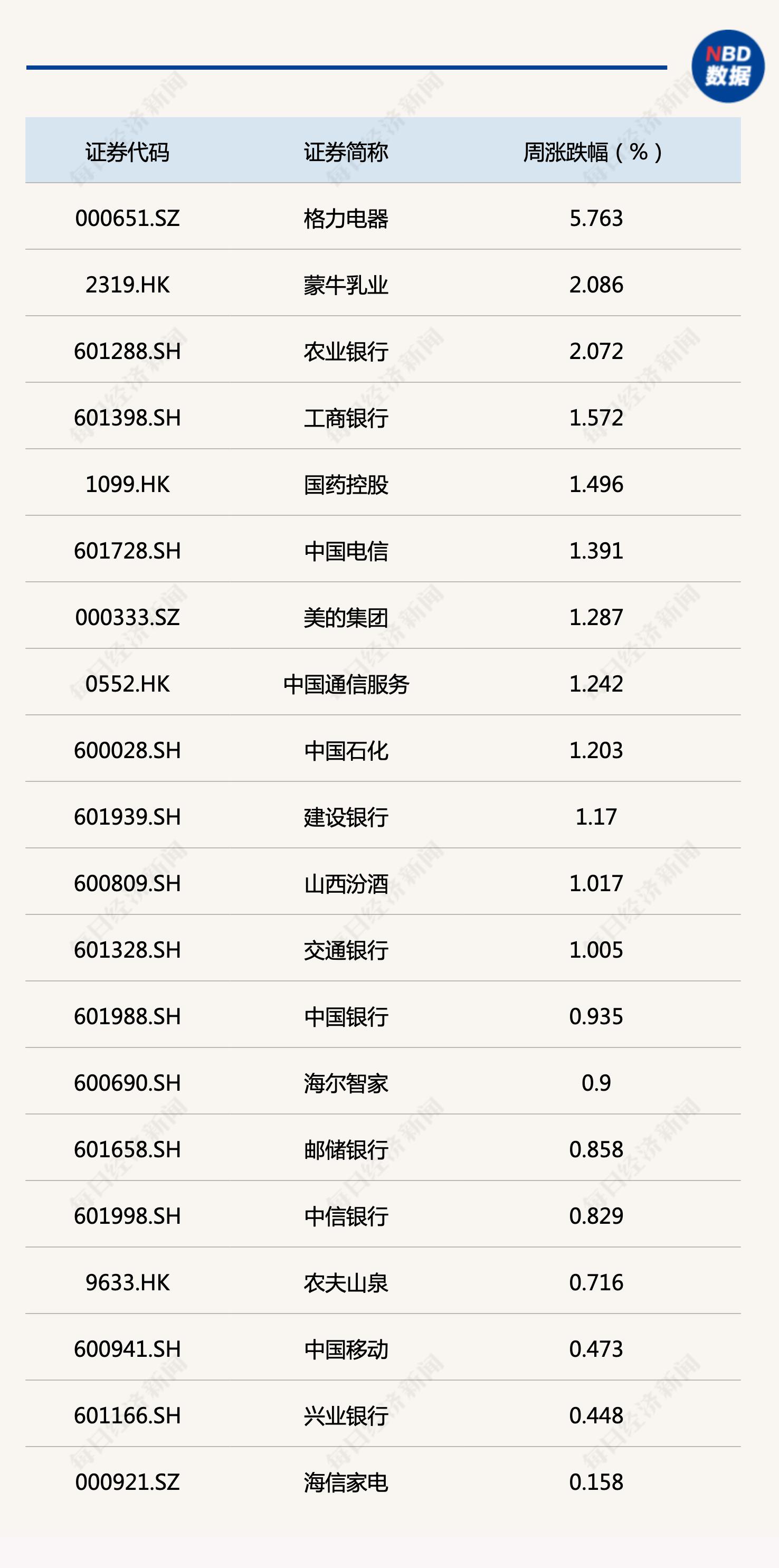 从本周每经品牌100指数成分股表现来看,银行、石油以及家电等行业股息率相对较高的龙头股走势较强,基本实现逆势上涨。其中,格力电器周涨5.76%,涨幅最大;蒙牛乳业、农业银行周涨幅也超过2%。