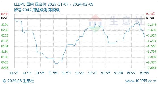 2月5日,生意社LLDPE基准价为8217.14元/吨,与本月初(8257.14元/吨)相比,下降了-0.48%。