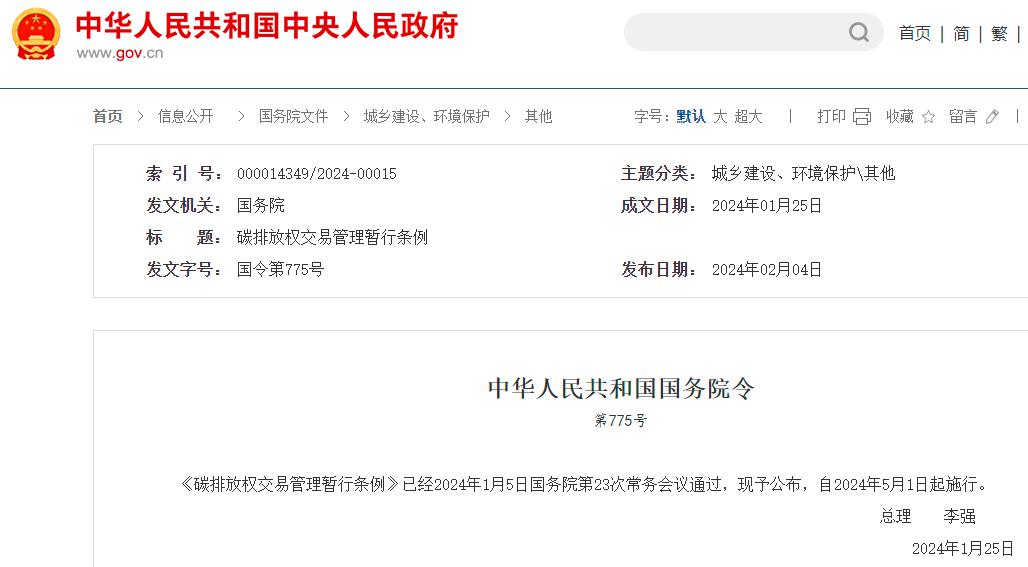 2月4日,中国政府网发布公告称,《碳排放权交易管理暂行条例》(下称《条例》)将于2024年5月1日起施行。业内人士认为,《条例》对于碳排放权的法律属性有更加清楚的界定,不仅有利于全国碳排放权交易市场的扩容,也有利于金融业务在绿色低碳领域的延伸。