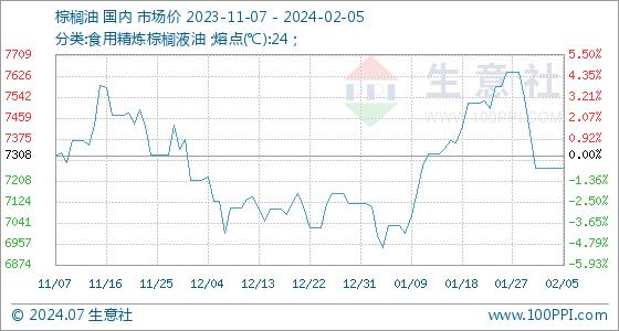 2月5日,生意社棕榈油基准价为7258.00元/吨,与本月初持平。