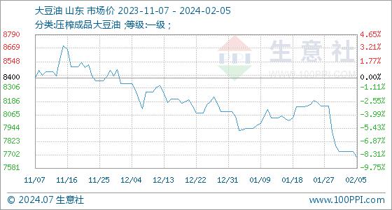 2月5日,生意社大豆油基准价为7730.00元/吨,与本月初持平。