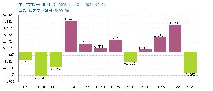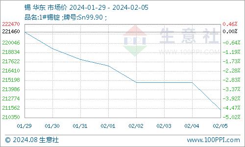 据生意社商品行情分析系统监测:本周(1.29-2.5)华东地区1#锡锭震荡下跌,上周初市场均价在221460元/吨,本周初市场均价在211360元/吨,周跌4.56%。