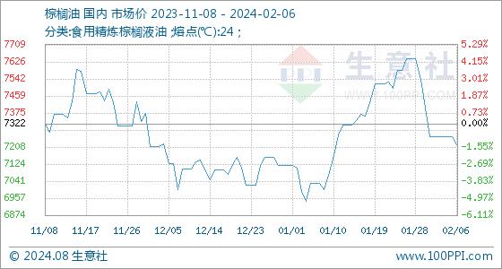 2月6日,生意社棕榈油基准价为7258.00元/吨,与本月初持平。