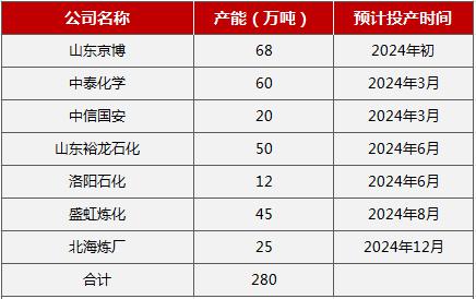 苯乙烯的需求主要在于三大下游,三大下游对苯乙烯的消费占比分别为:EPS占24%、PS占24%和ABS占22%,总计占总消费70%,近几年随着PS和ABS产能扩张,其在苯乙烯消费占比提升。2024年而言,根据装置投产计划和年均开工率初步估算,苯乙烯新增产量204万吨,三大下游新增需求量460万吨,供需差为-256万吨,意味着苯乙烯供应压力将有所缓解。综上所述,三大下游产能上升利好苯乙烯行情。