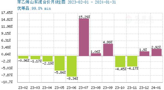 2023年苯乙烯价格总体呈现“震荡下跌-上涨-震荡回落”的走势,从生意社月K柱图来看,2023年苯乙烯价格下跌月份数多于上涨月份数,其中7月上行幅度最大,达到15.29%,6月下行幅度最大,达到8.34%。
