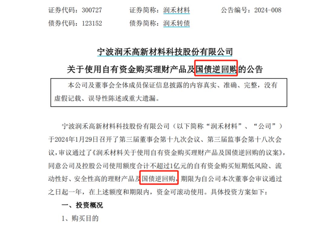 1月30日,上市公司润禾材料发布了《关于使用自有资金购买理财产品及国债逆回购的公告》。公告称,公司于2024年1月29日召开了第三届董事会第十九次会议、第三届监事会第十八次会议,审议通过了《润禾材料关于使用自有资金购买理财产品及国债逆回购的议案》,同意公司及控股公司使用额度合计不超过1亿元的自有资金购买短期低风险、流动性好、安全性高的理财产品及国债逆回购,期限为自公司本次董事会审议通过之日起一年,在上述额度和期限内,资金可滚动使用。
