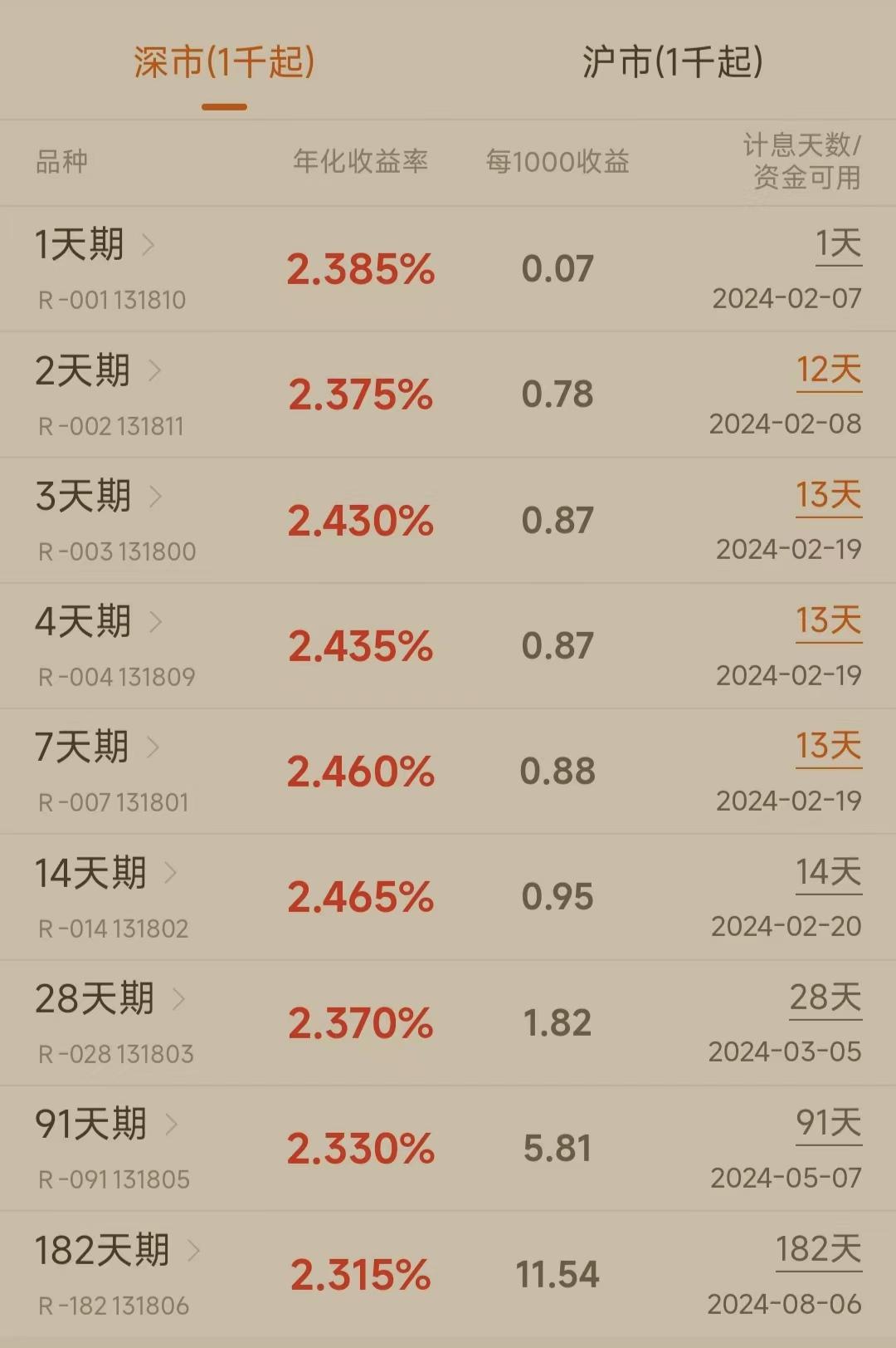 单从计息时间来看,目前春节国债逆回购最佳操作日期是本周三(2月7日)。当日,投资者可以借出1天期逆回购(沪市逆回购简称GC001,代码204001;深市逆回购简称R-001,代码131810),就可以收获11天利息,资金在2月19日盘前已可取。