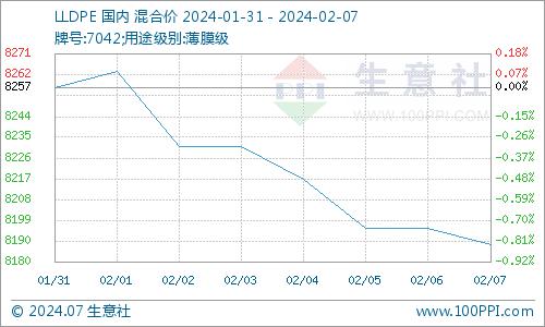 据生意社商品行情分析系统监测,LLDPE(7042)1月31日国内价格在8257元/吨,2月7日均价在8188元/吨,期间报价下跌幅度0.83%。