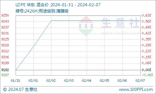 据生意社商品行情分析系统监测,LDPE(2426H)1月31日国内价格在9192元/吨,2月7日均价在9245元/吨,期间报价上涨幅度0.57%。