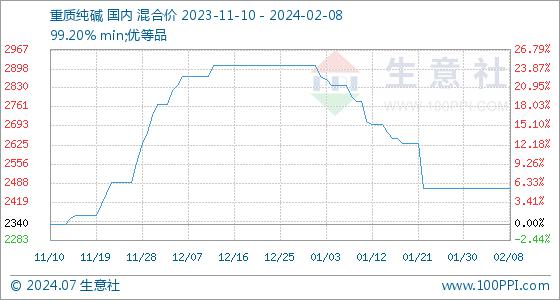 2月8日,生意社重质纯碱基准价为2470.00元/吨,与本月初持平。