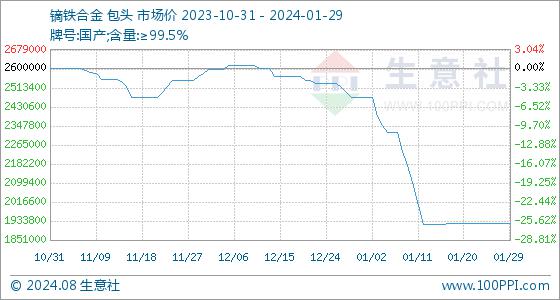 1月29日,生意社镝铁合金基准价为1925000.00元/吨,与本月初(2470000.00元/吨)相比,下降了-22.06%。
