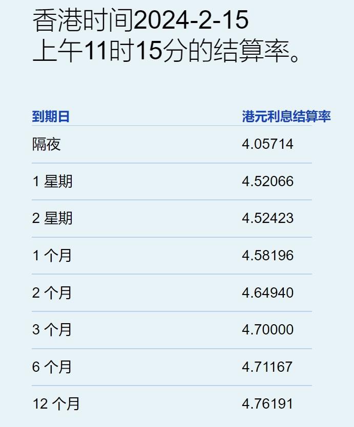 2月15日,港元拆息续个别发展。隔夜拆息连跌2日,跌至4.05714%,较上日再跌约8基点。1星期、2星期拆息则微升,分别报4.52066%和4.52423%。与楼按相关的1个月拆息续升,升至4.58196%,再升近4基点。反映银行资金成本的3个月拆息微升至4.7%。长息方面,6个月拆息微升至4.71167%,而1年期拆息则微跌至4.76191%。