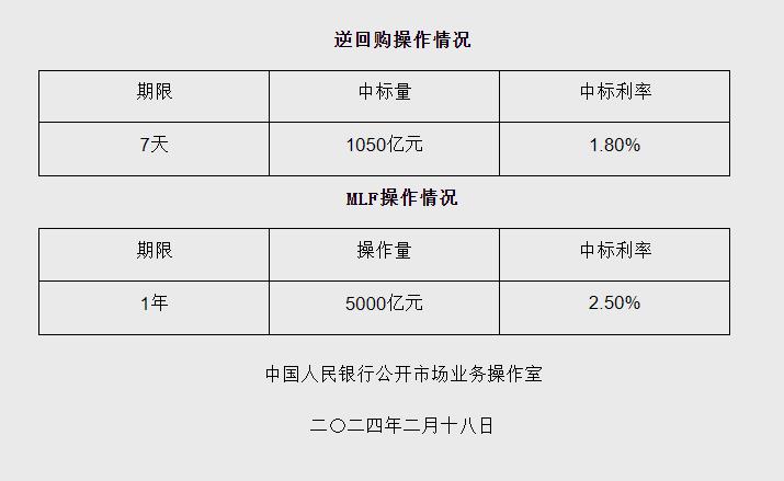 2月18日,央行网站公告称,为维护银行体系流动性合理充裕,今日开展1050亿元公开市场逆回购操作和5000亿元中期借贷便利(MLF)操作,利率分别维持1.8%、2.5%。