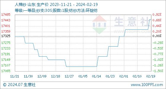 2月19日,生意社人棉纱基准价为17450.00元/吨,与本月初(17325.00元/吨)相比,上涨了0.72%。