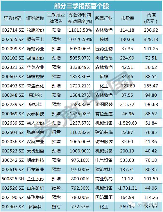 此外,海翔药业、冠福股份、华英农业和华媒控股的预增幅度也排名前列,分别预计三季报净利润将同比增长60.5倍、50.55倍、33.38倍和18.53倍,它们的所属行业分别是医药生物、商业贸易、农林牧渔和传媒。