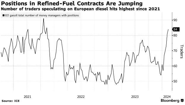 上周,持有欧洲基准柴油合约头寸的基金经理数量升至2021年以来最多,美国柴油合约也达到了类似里程碑。