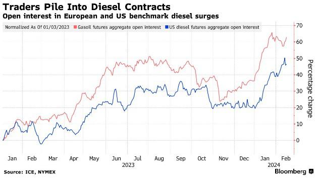 例如,欧洲和亚洲柴油价格之间的差额(在洲际交易所上交易的东西方价差)在1月出现大幅波动,交易量创下历史新高。欧洲炼油厂生产中断,叠加为躲避胡塞武装的红海袭击,船只绕道非洲导致货运成本飙升,种种因素都导致了柴油价格的波动。