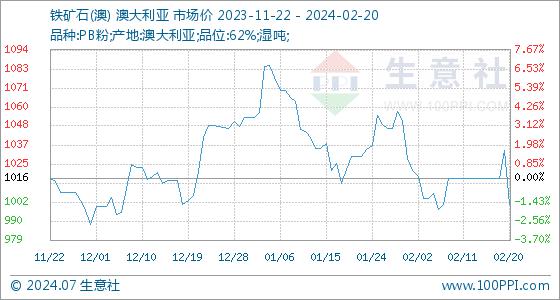 2月20日生意社铁矿石(澳)基准价为1033.56元/吨