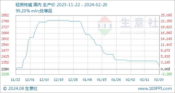 2月20日,生意社轻质纯碱基准价为2350.00元/吨,与本月初(2370.00元/吨)相比,下降了-0.84%。