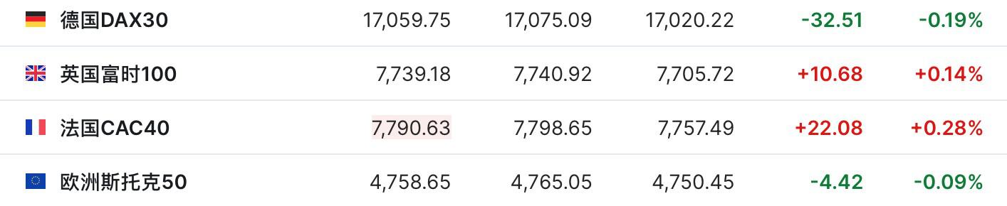 2.截至发稿,德国DAX指数跌0.19%,英国富时100指数涨0.14%,法国CAC40指数涨0.28%,欧洲斯托克50指数跌0.09%。