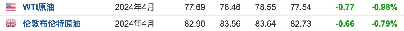 3.截至发稿,WTI原油跌0.98%,报77.69美元/桶。布伦特原油跌0.79%,报82.90美元/桶。