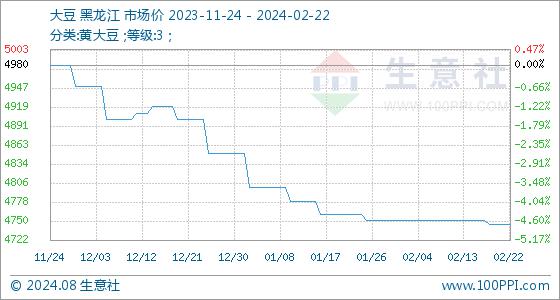 2月22日,生意社大豆基准价为4746.00元/吨,与本月初(4752.00元/吨)相比,下降了-0.13%。