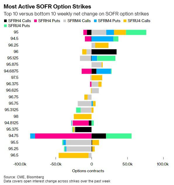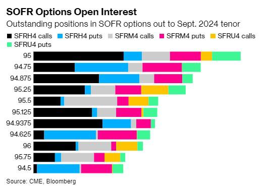 过去一周,SOFR期权的流动主要集中在通过6月24日和9月24日的看涨和看跌期权结构增加95.00的未平仓合约风险。围绕未平仓合约的流动包括买入的SFRU495.00/95.50/95.75/96.25鹰式看涨组合与卖出的SFRM596.25/97.00/98.50/99.25鹰式看涨组合。在其他平仓方面,3月24日看跌期权仓位大幅下降,原因是与比率策略的亏损平仓有关。