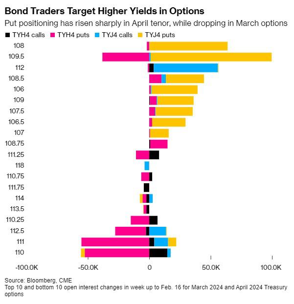 过去一周,许多4月到期的10年期国债期权出现了大幅波动,包括108.00看跌期权和112.00看涨期权,此前出现了5万份108.00/112.00期权的巨大下行风险逆转,目标是10年期国债收益率约为4.65%。本周其他显著变化出现在4月到期的109.50看跌期权中。另一方面,3月到期的10年期国债111.00和110.00看跌期权在本周出现大量平仓。