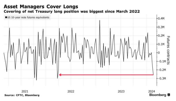 根据美国商品期货交易委员会(CFTC)截至2月13日的一周数据(包括1月份CPI数据公布后),约26万份10年期美国国债期货合约当量的净变动,风险权重相当于1620万美元/DV01,这是自2022年3月以来最大的多头头寸平仓。