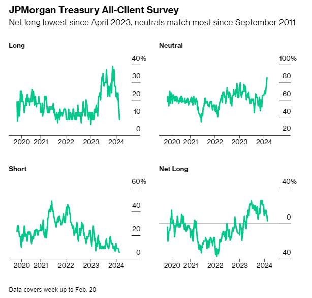 在截至2月20日的一周内,客户的净多头头寸下降了6个百分点,使净多头头寸降至2023年4月以来的最低水平。中性头寸继续攀升,目前与2011年9月以来的最高点持平,反映出投资者对美国国债收益率的未来走势缺乏信心。